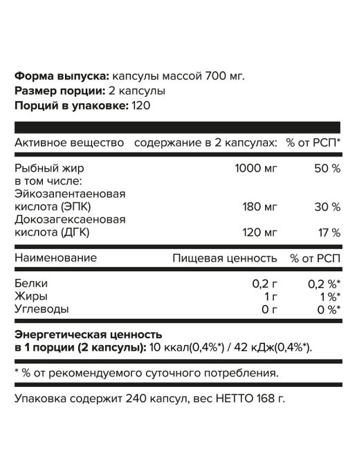 Эйкозапентаеновая кислота (ЭПК): 180мг