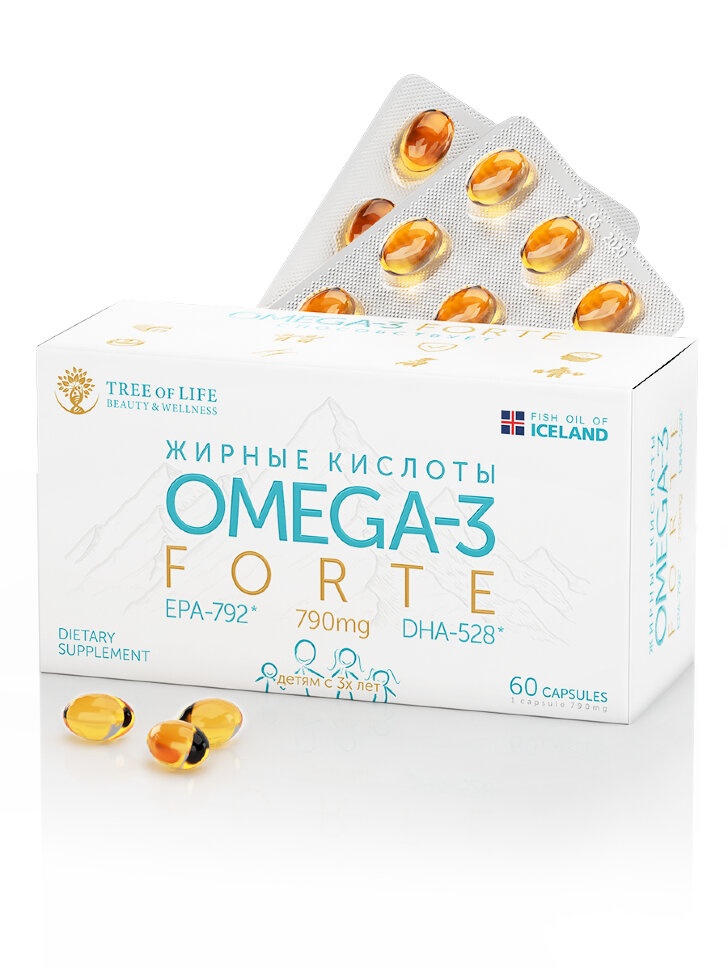 Омега-3 способствует снижению уровня стресса, ускорению метаболизма и процесса похудения, снижению риска формирования инфарктов и инсультов и способствует улучшению подвижности суставов. Главными и самыми ценными компонентами Омега-3 являются жирные кислоты EPA и DHA (ЭПК и ДГК) и Omega-3 Forte отличает их высокое содержание на порцию.