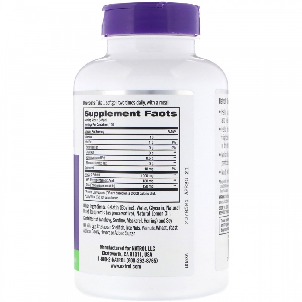 Natrol Omega-3 Fish Oil проходит молекулярную дистилляцию для устранения пестицидов, ПХБ и тяжелых металлов.