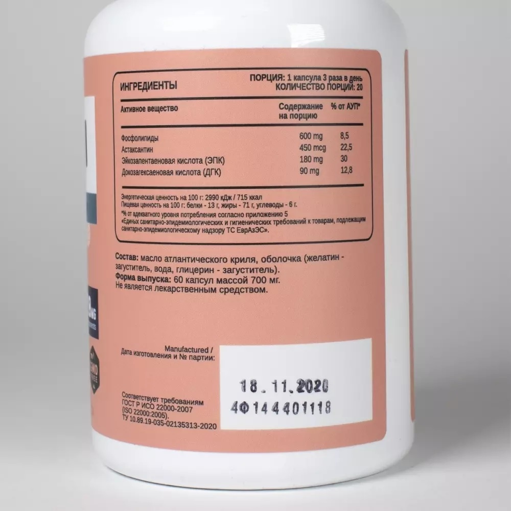 Состав: масло атлантического криля, оболочка (желатин - загуститель, вода, глицерин - загуститель).