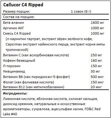 Предтренировочный комплекс C4 Ripped от Cellucor станет вашим незаменимым помощником в вопросе сжигания жира и сможет при этом давать энергию для проведения более интенсивной тренировки. И все за счет специальных компонентов в составе: карнитина, а также экстрактов зеленого кофе, кайенского перца и мяты тропической. Каждый из данных компонентов вносит вклад в результативность данного комплекса.