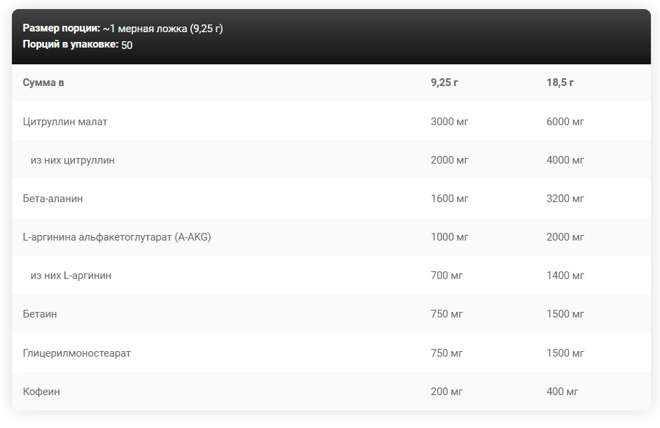 Ингредиенты: цитруллина малат, бета-аланин, L-аргинин альфакетоглутарат (A-AKG), бетаин безводный, стабилизатор (глицерилмоностеарат), регулятор кислотности (E500(ii)), антислеживатель (E551), ароматизаторы, кофеин безводный, соль, концентрат сока красной свеклы , концентрат черной моркови , подсластители (ацесульфам К, сукралоза, стевиолгликозиды из стевии), краситель/красители [(E160a) , (E110) 4 ] .Е110.