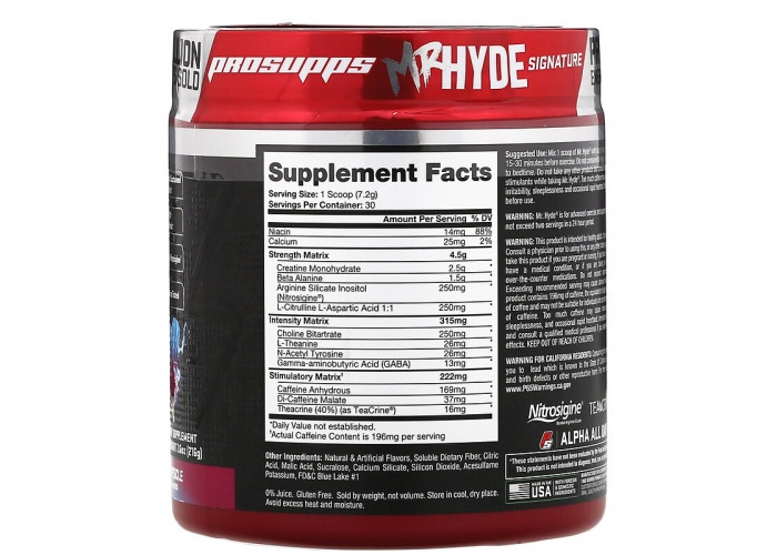 Рекомендация по применению: Смешайте 1 мерную ложку Mr. Hyde и 8 жидк. унций холодной воды. Принимайте за 15–30 минут до спортивной тренировки. Не принимайте Mr. Hyde за 4 часа до сна.