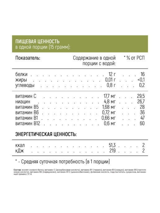 Способ приготовления: смешайте одну порцию продукта 15 г (1 мерная ложка) с 200-250 мл воды комнатной температуры в шейкере или блендере до однородной массы.