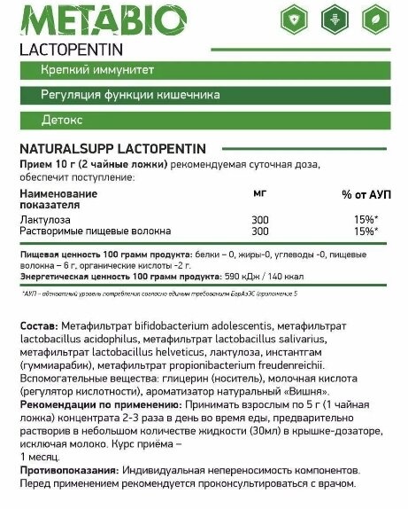 В состав Лактопектина Metabio входят метафильтраты пяти наиболее распространённых симбиотических бактерий нашего организма: bifidobacterium adolescentis, lactobacillus acidophilus, lactobacillus salivarius, lactobacillus helveticus, propionibacterium freudenreichii, а также – лактулоза.