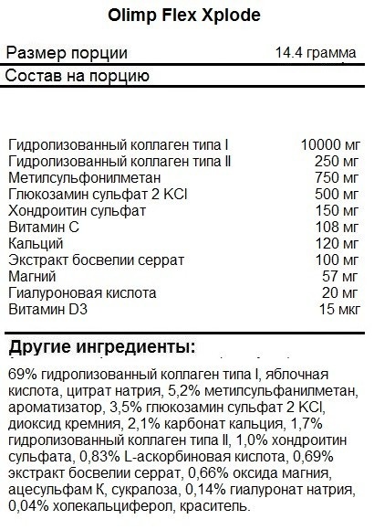 Формула Flex Xplode включает разные типы коллагена, МСМ, глюкозамин сульфат, хондроитин сульфат, экстракт босвеллии, витамины С и Д3, кальций и магний, гиалуроновую кислоту.