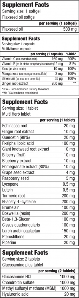 Комплекс Arthro Guard Pack объединил в себе свойства различных веществ и обеспечивает всесторонний уход за суставами. Его супер-формула включает 1000 мг глюкозамина, 1000 мг метилсульфонилметана и 500 мг льняного масла. Кроме того, в каждой упаковке содержится особый комплекс лекарственных трав, содержащий такие ценные компоненты, как бромелия или босвеллия.