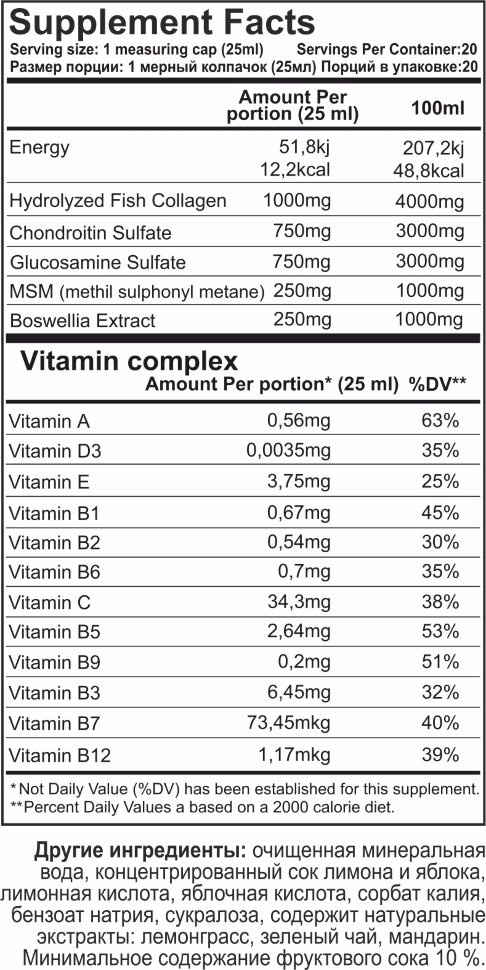 - Во время занятий спортом, в случае избыточного веса, серьёзного повреждения суставов, соединительной ткани и плохого состояния волос, кожи и ногтей: базовая дозировка может быть повышена до двух приё-мов продукта по 25 мл в течение дня (между приёмами пищи).