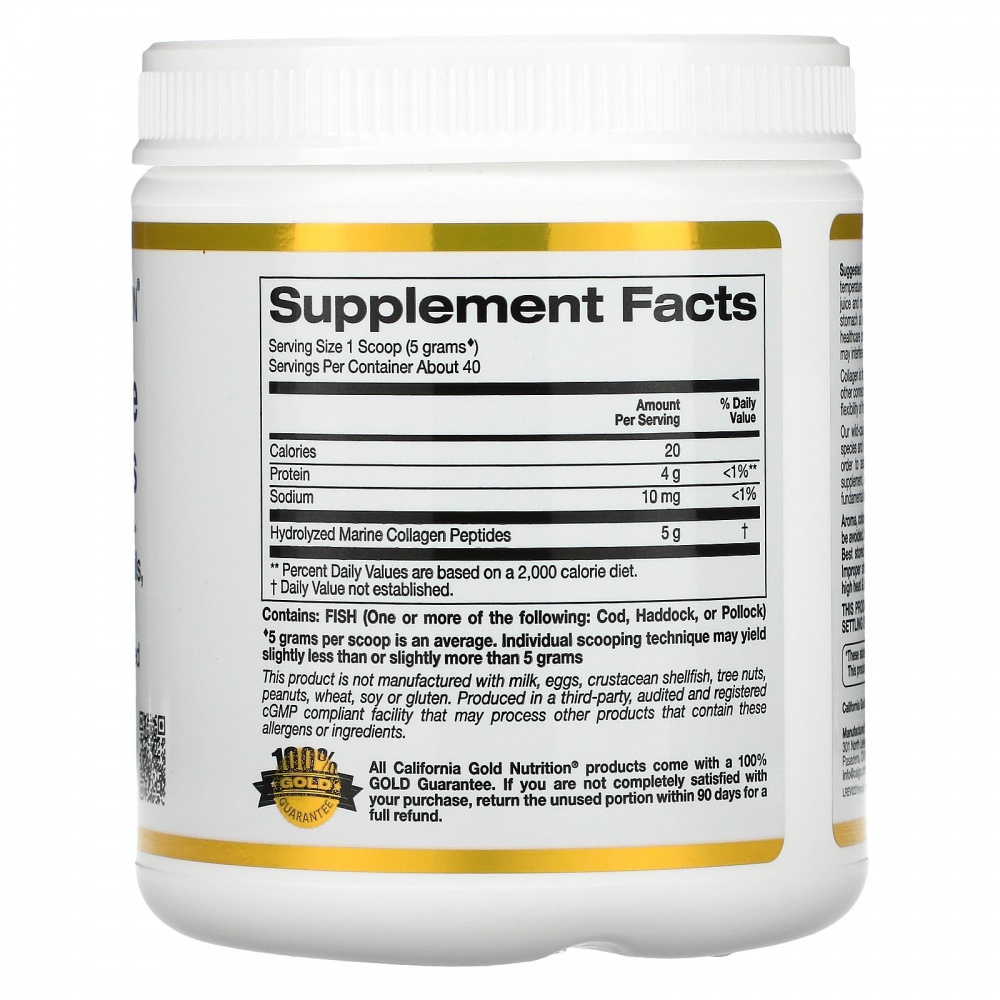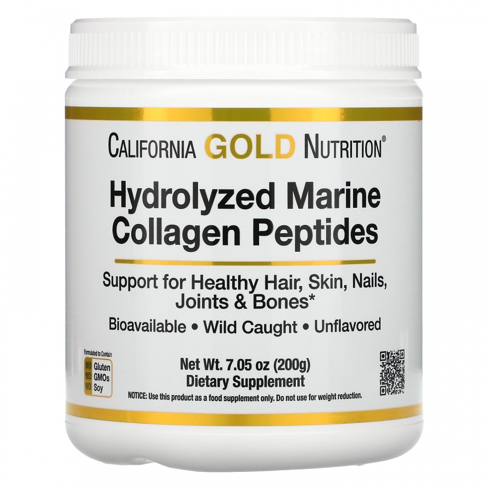 Пептиды гидролизованного морского коллагена от California Gold Nutrition содержат морской коллаген природного происхождения без ароматизаторов, который производится из кожи глубоководных и холодноводных видов рыб дикого улова. Коллаген гидролизуется ферментами (расщепляется) на аминокислотные пептиды, что способствует улучшению его усвоения и биодоступности.