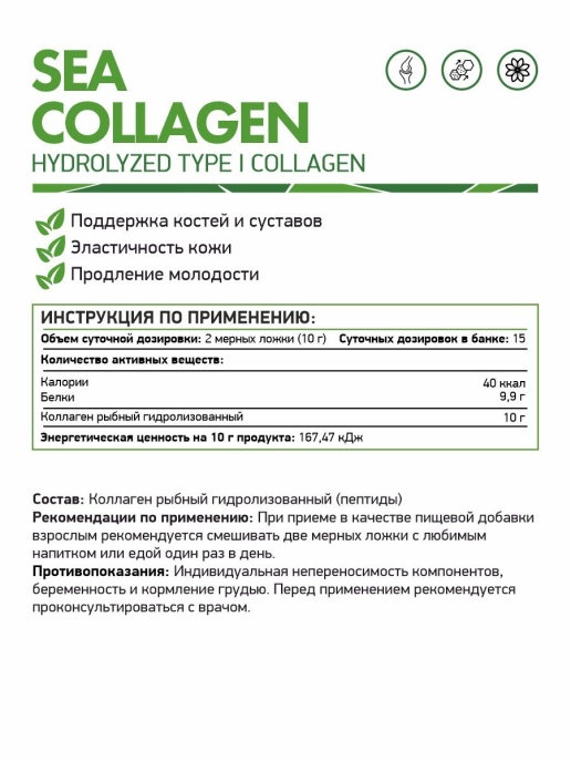 Также морской коллаген (Sea Collagen) является строительным компонентом двигательной системы и кожного покрова. Прием коллагена считается отличной профилактикой проблем с опорно-двигательной системой.