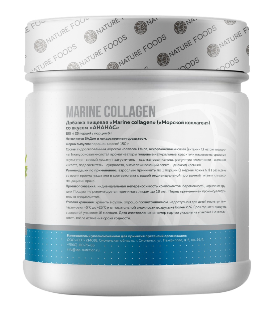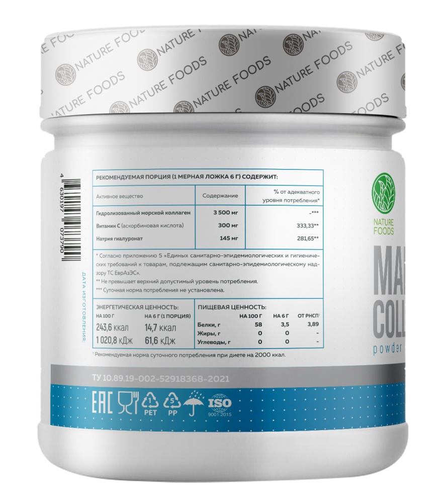 Морской коллаген является основным компонентом соединительной ткани, необходим для здоровья кожи, волос, ногтей и суставов. Витамин С способствует нормальному образованию коллагена для нормального функционирования кровеносных сосудов, костей, хрящей, десен, кожи и зубов. Marine Collagen - это высококачественный продукт, разработанный для максимального усвоения. Коллаген производится только из кожи дикой атлантической трески, которая является продуктом 1-ой категории по составу белков, жиров и аминокислот. Атлантическая треска дикого вылова, из которой производится коллаген Nature Foods, обитает в холодных и чистых водах Баренцева моря. Благодаря этому продукт получается абсолютно безопасным. Именно в коже трески самая высокая и правильная концентрация заменимых и незаменимых аминокислот и, только при ее переработке, остается минимальное количество токсичных элементов. Белок коллагена, получаемый из рыб является максимально близким по биохимическому составу к человеческому.