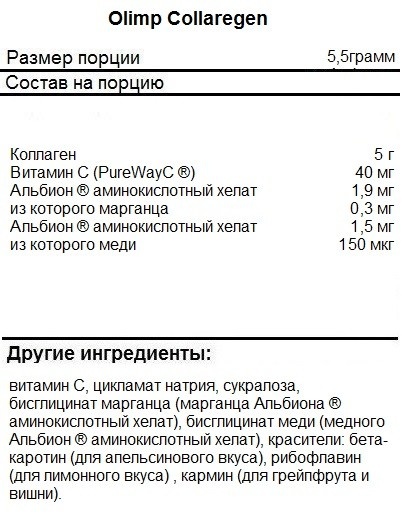 Olimp Collaregen – добавка с коллагеном в порошковой форме, обогащенная витаминами и минералами. Она создана для восполнения потребностей организма в коллагене, который является основным структурным компонентом хрящей, суставов и других соединительных тканей. С помощью продукта можно обеспечить нормальное функционирование опорно-двигательного аппарата и его защиту от травм, которые существенно тормозят достижение высоких спортивных результатов.