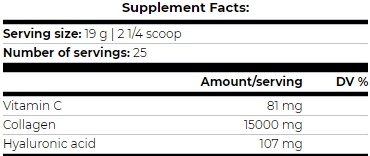 (фруктовый пунш): гидролизованный коллаген 79%, ароматизаторы, кислота (яблочная кислота, лимонная кислота), инулин, соль, гидролизованный порошок хряща 0,63%, гиалуроновая кислота 0,62%, l-аскорбиновая кислота, подсластители (сукралоза, ацесульфам к), цвет(кармин, бриллиантовый синий fcf)