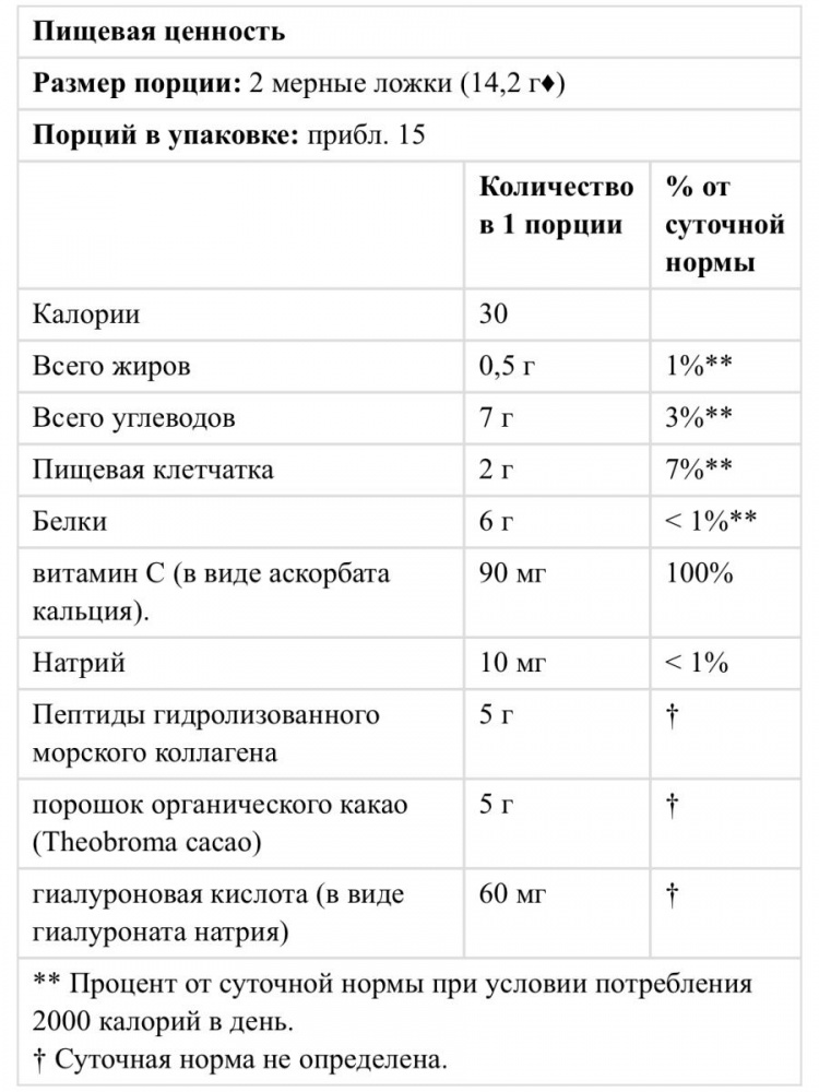 Состав: Пептиды гидролизованного морского коллагена, порошок органического какао, гиалуроновая кислота, витамин С.