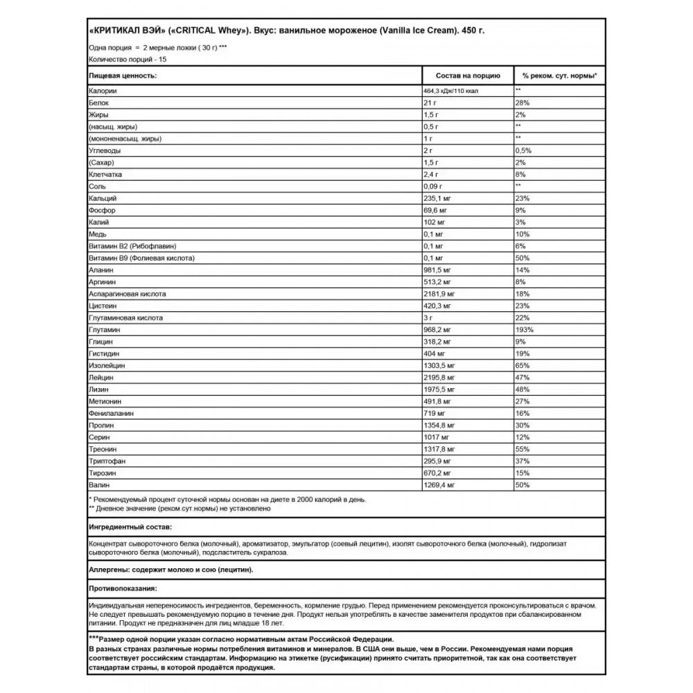 Critical Whey Protein был разработан с использованием уникальной смеси концентрата сывороточного протеина, Изолята сывороточного протеина и гидролизованного сывороточного протеина. Концентрат сывороточного протеина производится по технологии ультрафильтрации и содержит высокий уровень белка и аминокислот с разветвленной цепью (ВСАА). Изолят сывороточного протеина является белком высочайшего качества и производится с использованием перекрестной микрофильтрации. Гидролизованный сывороточный протеин - это предварительно переваренный белок, ферментативно расщепленный на пептиды. Эти белки с высокой биологической ценностью и легко усваиваемые поддерживают рост и поддержание мышечной массы.