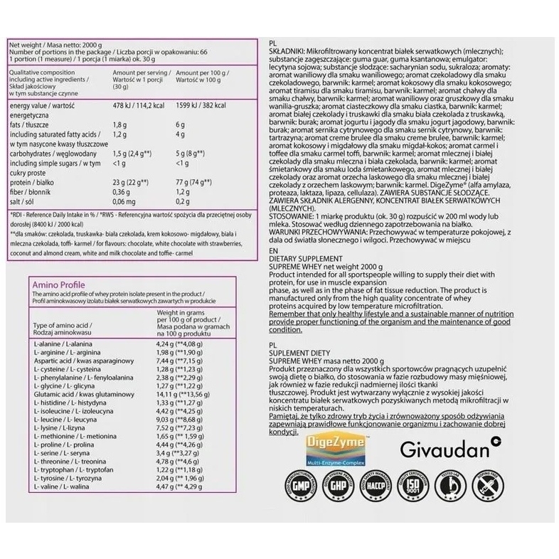 SUPREME WHEY – это не только вкуснейший протеиновый коктейль, рекомендуемый фанатам фитнеса и тяжелых тренажеров. По сути, не содержа в своем составе трансжиров, искусственных красителей и аспартама, он с успехом подходит в качестве питания для всех, кто следит за стройностью своего тела или ищет разнообразия и альтернативы другим полезным продуктам. Одним словом, если следишь за собой, своим здоровьем, этот препарат обязательно должен присутствовать среди других, любимых тобой продуктов спортивного питания.