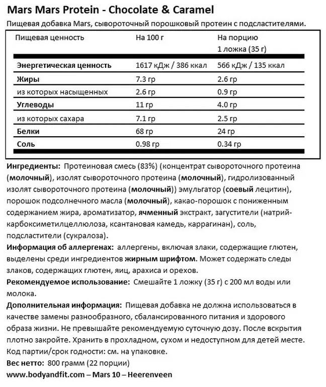 Если вам нравятся батончики Mars, вам понравится этот высококачественный 100%-й протеиновый порошок с таким же великолепным вкусом! Mars Protein разработан специально для наращивания и поддержания мышечной массы и содержит 24 г сывороточного протеина на порцию. Принимайте его после тренировки или в любое время дня: он станет вашим верным помощником в достижении спортивных целей и поддержании тонуса и идеальной физической формы.