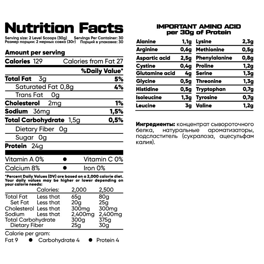 Мы учли все пожелания наших покупателей и создали продукт, идеально подходящий спортсменам. Удобный объем, упаковка и на 100% работающий протеин. В одной порции содержится 24 гр белка и всего лишь 129 калорий. Насыщенный вкус с богатой ароматикой — еще один повод добавить PRO WHEY в свой рацион.