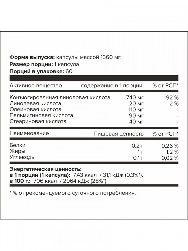 Конъюгированная линолевая кислота CLA относится к группе незаменимых полиненасыщенных жирных кислот, которая не вырабатывается в нашем организме, поэтому должна поступать извне. CLA стимулирует иммунитет, нормализует обмен веществ, снижает уровень холестерина, способствует снижению веса за счет уменьшения жировой ткани, контролирует аппетит, используется при профилактике раковых, сердечно - сосудистых заболеваниях и имеет противовоспалительное действие. Именно поэтому эта добавка пользуется большой популярностью, как у профессиональных спортсменов, так и у обычных людей, которые следят за своим здоровьем и регулярно посещают спортзал, чтобы иметь красивое и подтянутое тело.
