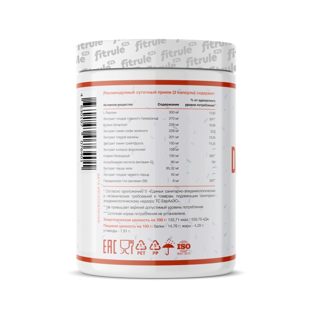 Состав: L-тирозин; Экстракт плодов горького померанц, холина битартрат (витамин В), экстракт семян зеленого кофе, экстракт плодов малины, экстракт семян грейпфрута, экстракт колеуса форсколии, кофеин безводный, аскорбиновая кислота (витамин С), экстракт перца чили, экстракт плодов черного пера, гиридоксина гидрохлорид (витамин Вб), желатиновая капсула (желатин — загуститель, вода, диоксид титана — краситель), антислеживающий агент — диоксид кремния.