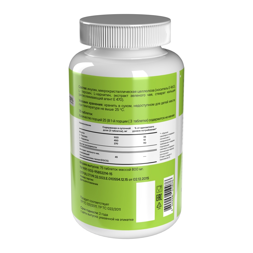 В состав продукта входит L-карнитин, L-тирозин, экстракт зелёного чая с высоким содержанием эпигаллокатехин галлата и природного пребиотика инулина.