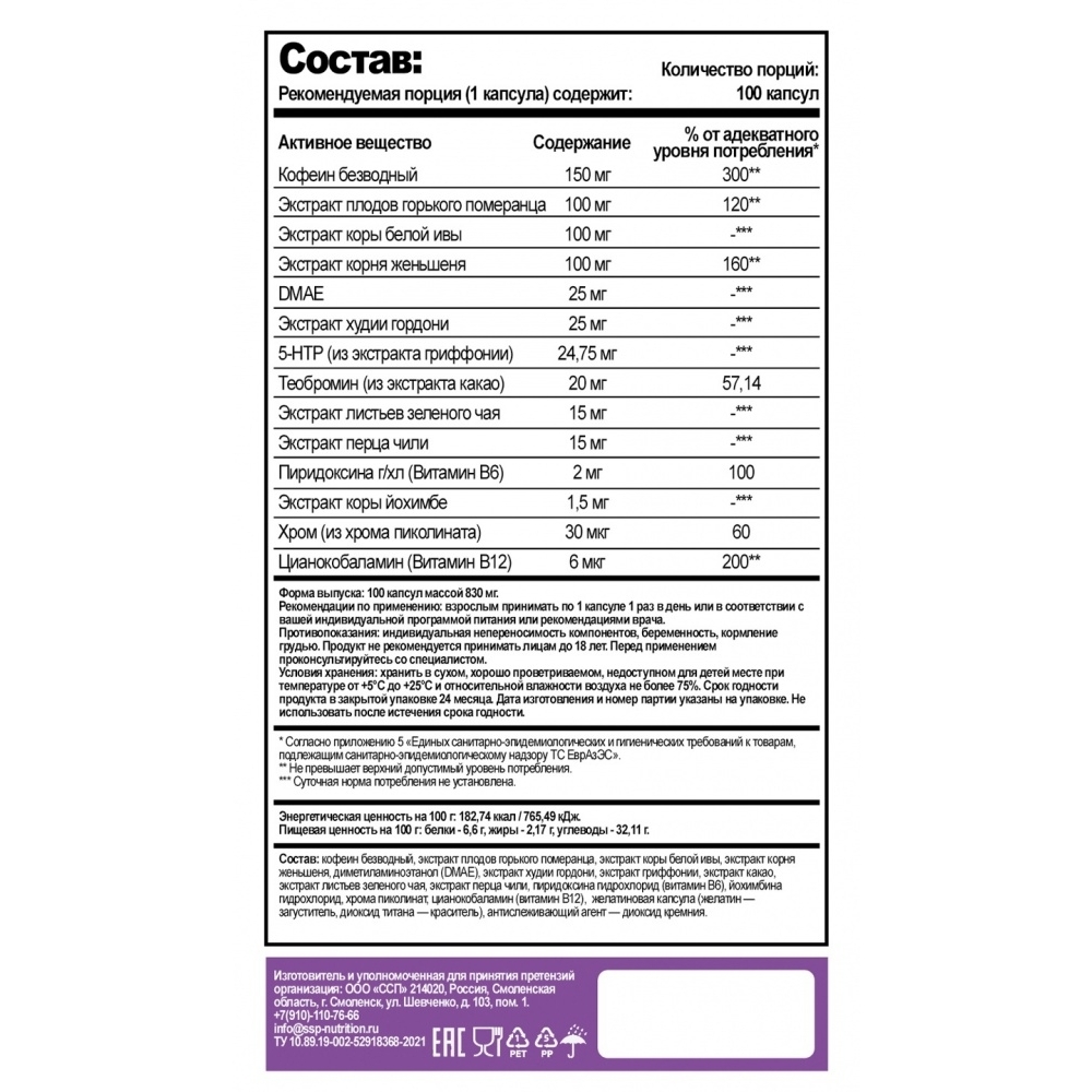 Энергетик Cybermass Caffein + Theanine в блистерах 500 мг 60 капсул