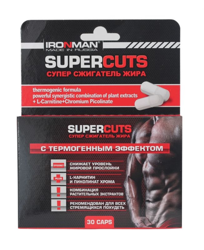 Современный жиросжигатель Super Cuts IRONMAN представляет сосбой сочетание эффективных для снижения веса компонентов, усиливающих действие друг друга. Кроме растительных компонентов - стимуляторов обменных процессов и термоджеников: экстракта ореха колы, экстракта грейпфрута, порошка перца и горчицы в состав формулы вошли: