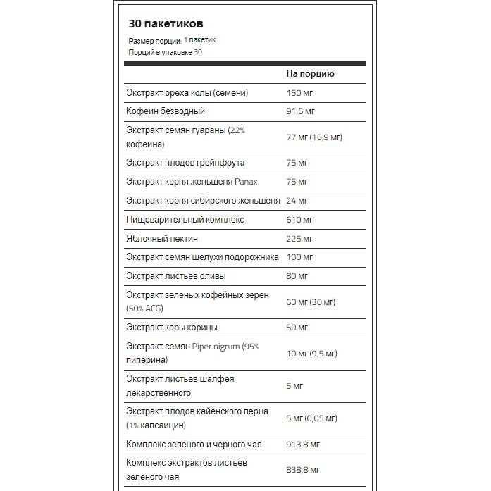 | Экстракт зеленых кофейных зерен (50% ACG): | 60 мг (30 мг) |