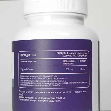 Состав: L-таурин, желатиновая капсула (желатин – загуститель, вода).
