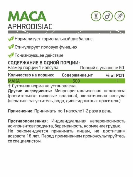МАКА- является травянистым многолетним растением, основным назначением препаратов из корня маки перуанской является лечение пониженного полового влечения (в том числе «холодность» и менопауза у женщин) и эректильной дисфункции у мужчин (снижение потенции). Кроме этого препараты предположительно эффективны при бесплодии (олигоспермия), поскольку, как показывают исследования, систематический прием препаратов на основе экстракта маки значительно увеличивает число подвижных сперматозоидов. Последние исследования показывают положительный эффект экстрактов на функцию предстательной железы у крыс, что оправдывает их применение для профилактики аденомы простаты.