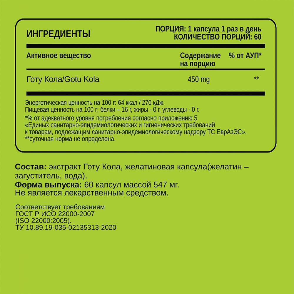 Готу Кола - лечебная трава, ее сила заключается в стимуляции мозга и сохранения процессов памяти, кроме того, данное растение омолаживает кожу и очищает от загрязнений. Особенности пищевой добавки Готу Коала: улучшает память и мышление, регенератор тканей ( заживление ран, ссадин, внутренних тканевых повреждений), активизирует работу сердца и снижет давление, активизирует пищеварительные процессы и обменные процессы( снижение веса), подпитка организма микроэлементами, борется со стрессами - избавляет от чувства тревоги , снимает напряженность, укрепляет стенки сосудов - эластичность, обновление структуры сосудов.