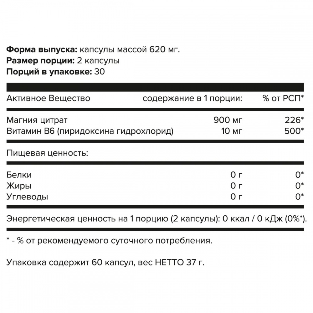 Состав: Магния цитрат, микрокристаллическая целлюлоза, твердая капсула (желатин, краситель – диоксид титана Е171), витамин B3 (пиридоксина гидрохлорид).