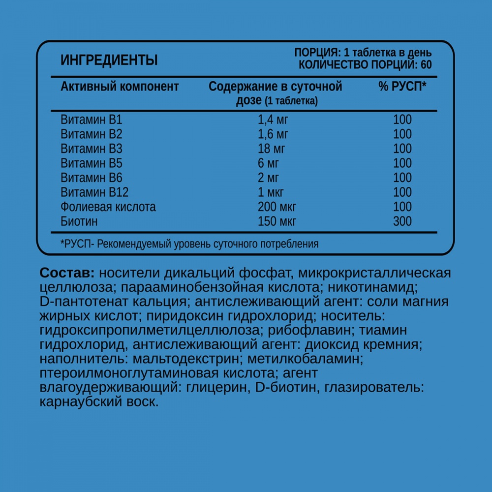 Состав: носители дикальции&774; фосфат, микрокристаллическая целлюлоза; парааминобензои&774;ная кислота; никотинамид; D-пантотенат кальция; антислеживающии&774; агент: соли магния жирных кислот; пиридоксин гидрохлорид; носитель: гидроксипропилметилцеллюлоза; рибофлавин; тиамин гидрохлорид, антислеживающии&774; агент: диоксид кремния; наполнитель: мальтодекстрин; метилкобаламин; птероилмоноглутаминовая кислота; агент влагоудерживающии&774;: глицерин, D-биотин, глазирователь: карнаубскии&774; воск.