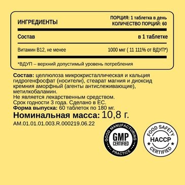 Состав: Целлюлоза микрокристаллическая и кальция гидрогенфосфат (носители), стеарат магния и диоксид кремния аморфный (агенты антислеживающие), метилкобаламин.