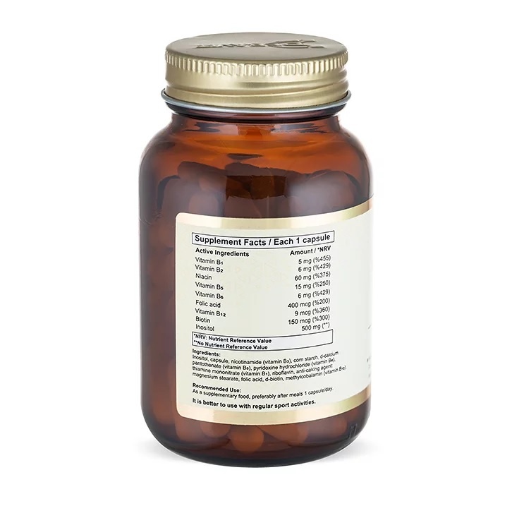 Комплекс состоит из 9 форм Витамина Б: Б1, Б2, Ниацин, Витамин Б5, Витамин Б6, Фолиевая Кислота, Витамин Б12, Биотин, Инозитол.
