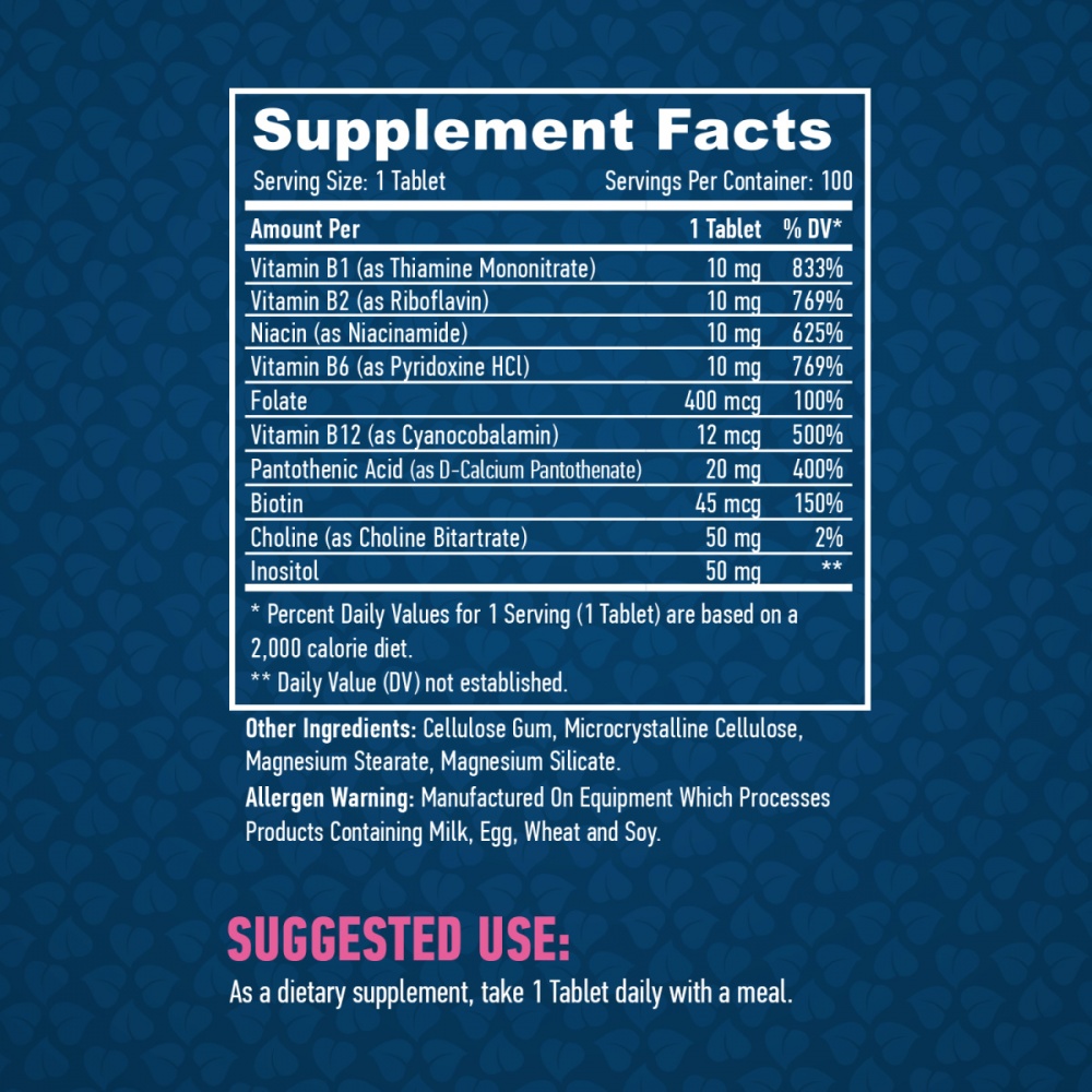 Содержит полный спектр витаминов группы В, которые улучшают общее состояние организма, стимулируют обмен веществ и оказывают благотворное влияние на нервную систему. Тиамин способствует работе печени и помогает пищеварительной системе. Рибофлавин стимулирует сухую мышечную массу, улучшает обмен веществ и играет важную роль в поддержании зрения. В состав формулы входит ниацин, который снижает уровень холестерина, высокое кровяное давление. Ниацин участвует в образовании глюкозы, снижает риск развития сердечных заболеваний. Пиридоксин предотвращает спазмы мышц ног, способствует усвоению организмом белка и стимулирует синтез нуклеиновой кислоты. Водорастворимый витамин В9, улучшает синтез аминокислот и белков. Витамин В12, стимулирует деятельность мозга и поддерживает метаболизм белков. Биотин поддерживает здоровье ногтей, волос и кожи. Холин способствует сжиганию излишков жира в организме. Витамин B8 способствует делению клеток и поддерживает образование клеточных мембран.