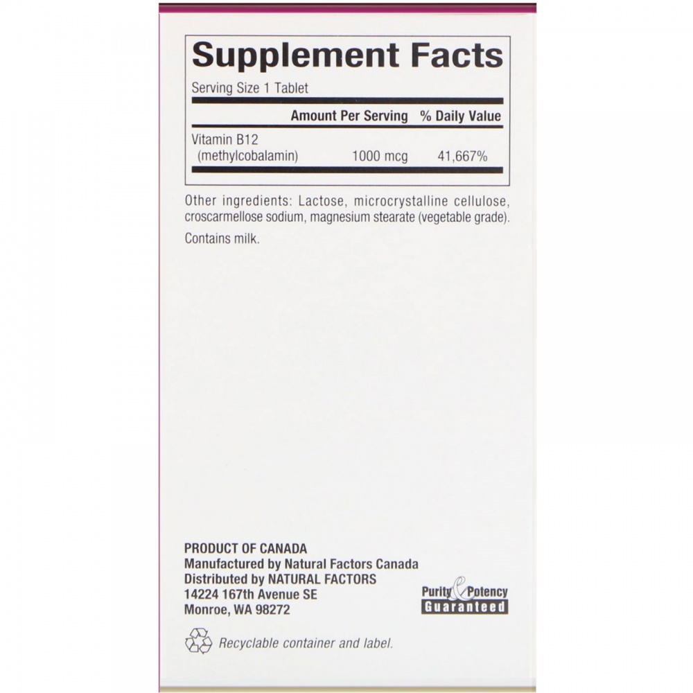 Витамины Natural Factors Витамин B12 Methylcobalamin 1000 mcg 180 жевательных таблеток