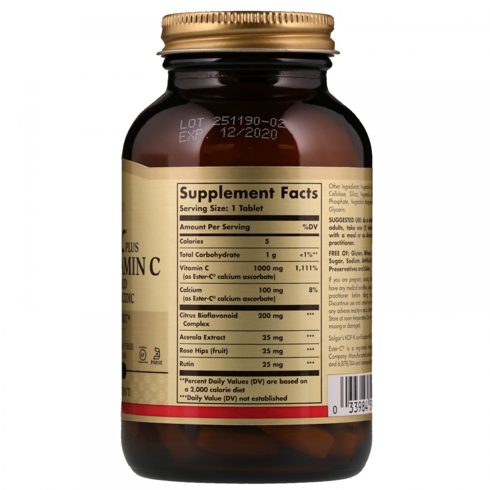 Ester-C Plus — продукт, разработанный Solgar, обеспечивает запатентованным, рН-нейтральным (не кислотообразующим) витамином С, который не вреден для желудка. Метаболиты витамина С в Ester-C положительно влияют на сохранение витамина С в клетках, обеспечивая дополнительные преимущества. Применяется специальный процесс для формирования уникального метаболитного комплекса аскорбата кальция. Это комплекс полезен антиоксидантами, поддерживает иммунную систему, включает природные биофлавоноиды, ягод ацеролы и порошок плодов шиповника.