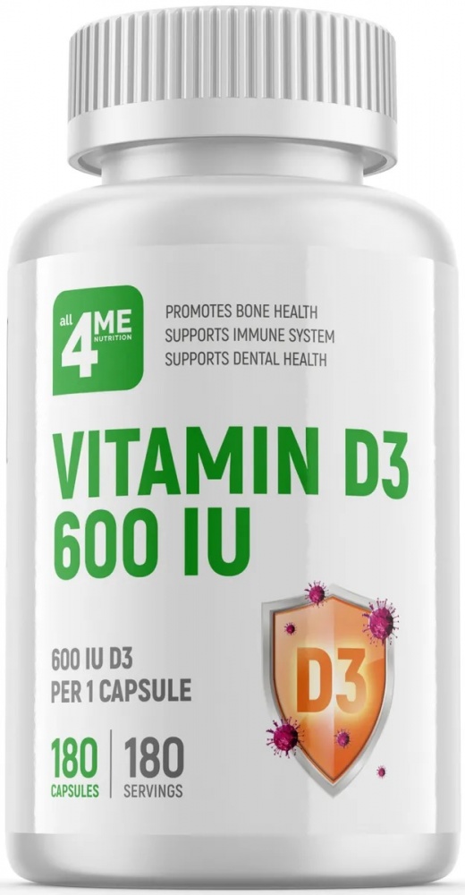 Vitamin D3 600 IU от ALL4ME NUTRITION — это источник витамина D3 (холекальциферола) в мягких желатиновых капсулах.
