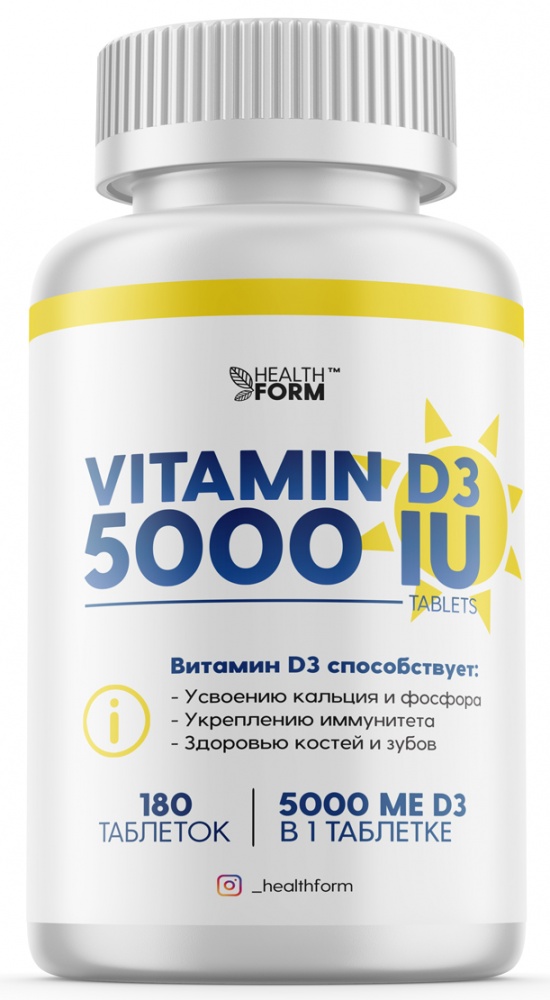Vitamin D3 5000 IU от HEALTH FORM - это источник витамина D3 (холекальциферола) в таблетках.