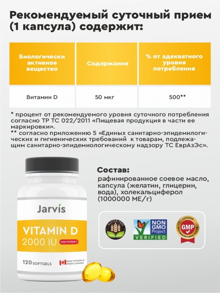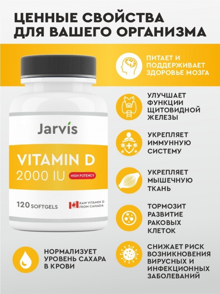 Jarvis Vitamin D 2000 IU - это источник витамина Д3 (холекальциферола) натуральная, легко усваиваемая форма витамин Д3 для поддержки иммунитета, здоровья мышц, строения костей, хорошего сна, развития памяти и красоты. Регулирует обмен и уровень содержания кальция и фосфора в организме, предотвращает развитие остеопороза, повышает иммунитет, снижая восприимчивость организма к инфекциям, улучшает настроение, наполняя организм серотонином - "гормоном счастья", на целый день. Дефицит витамина D у детей связан с высоким риском развития у них в будущем различных заболеваний: рахита, сахарного диабета, ожирения, онкологических, сердечно-сосудистых, воспалительных заболеваний кишечника и псориаза.