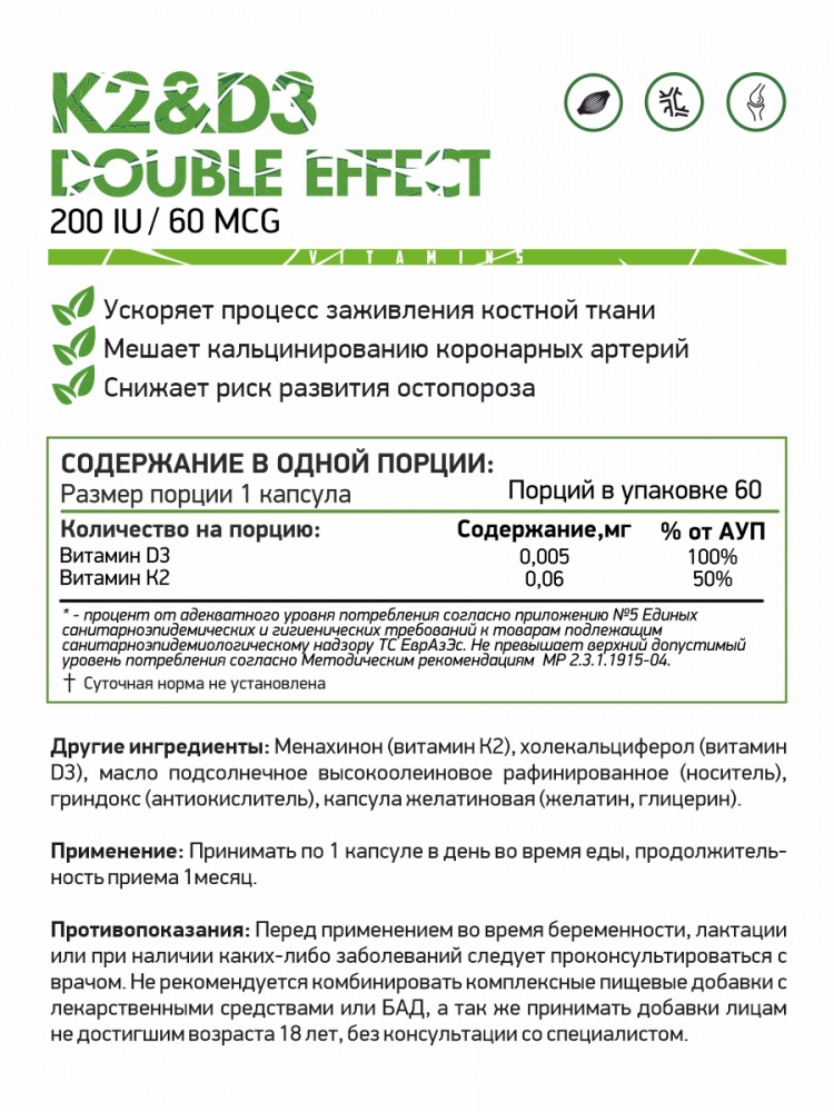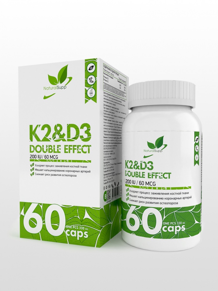 К2+Д3 - комплексная пищевая добавка, наиболее значимая форма, имеет важно значение для здоровья костей и сердечно-сосудистой системы. МенаQ7 – запатентованный витамин К2 в форме МК-7 (идентичный натуральному менахинон-7), играет незаменимую роль в здоровье сердечно-сосудистой системы и костной ткани. Витамин К2 активизирует матричный Gla-белок – сильный ингибитор кальцификации артерий, ингибирует возрастное уплотнение артерий и улучшает эластичность сосудов. Витамин К2 активирует остеокальцин – зависимый от витамина К белок, отвечающий за захват и связывание кальция в костной ткани, что ведет к повышению минерализации костей, их плотности и массы. Витамин D3 участвует в регуляции кальций-фосфорного обмена, усиливает всасывание Ca2+ и фосфатов в кишечнике и их реабсорбцию в почечных канальцах почек. Витамин Д способствует минерализации костей процесс формирования костной&774; ткани, необходим для нормального функционирования паращитовидных желез. Нарушения со стороны кишечника, недостаточность функции печени и желчного пузыря, недостаточная инсоляция уменьшают абсорбцию и выработку витамина D3.
