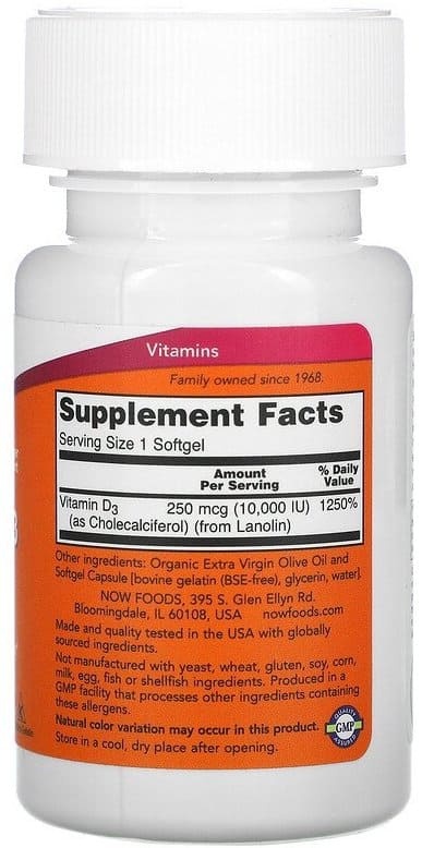 Желатиновые капсулы с витамином D-3 от NOW содержат этот важнейший витамин в форме высокоусваиваемых желатиновых капсул. Витамин D обычно получают с пищей или вырабатывается кожей из солнечного ультрафиолета. Тем не менее, пища содержит недостаточное количество этого витамина. И так как все большее количество людей избегает прямых солнечных лучей, становится совершенно необходимым употребление пищевых добавок с витамином D для того, чтобы ваш организм гарантированно получал его в достаточном количестве.