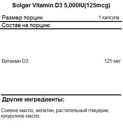 Витамин D3 (в виде холекальциферола): 125 мкг(5000 МЕ)