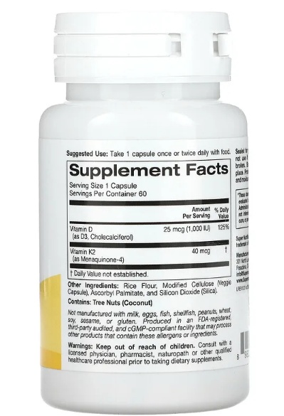 И витамин D3, и витамин K2 играют важную роль в организме и в целом важны для здоровья. Витамин D3 помогает организму усваивать кальций и фосфор, важные для формирования и поддержания прочности костей. Кроме того, витамин K2 может обеспечить дополнительную поддержку для развития крепких костей и сердечно-сосудистой системы, поскольку потенциально может способствовать здоровому свертыванию крови.