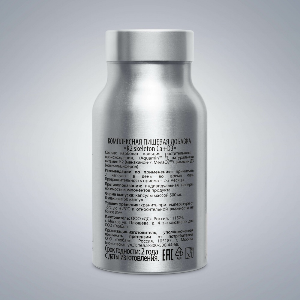 Компоненты комплекса K2 skeleton Ca + D3 - натуральный витамин К2 (менахинон-7) торговой марки MenaQ7, биодоступный кальций из брендированного сырья Aquamin из морской водоросли Lithothamnion и витамин D3 – в комбинации максимально поддерживают опорно-двигательную систему.