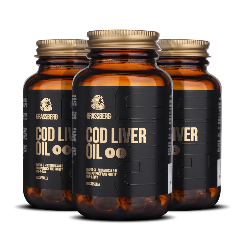 COD LIVER OIL GrassBerg – высококачественный жир из печени трески. Печень трески отличается высоким содержанием Омега-3 жирных кислот EPA и DHA, а также комплекс дополнен витаминами A, D и E.