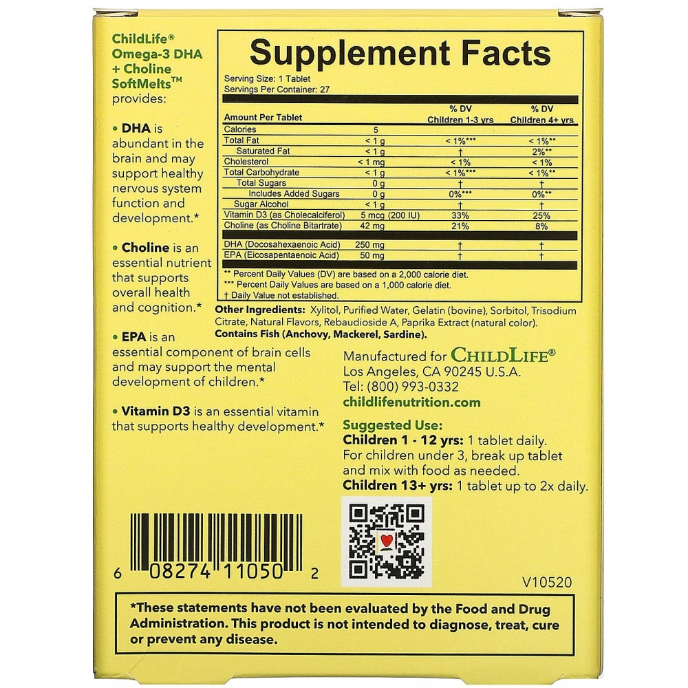 Добавка Омега-3 ДГК с холином SoftMelts от ChildLife включает указанные ниже ингредиенты.