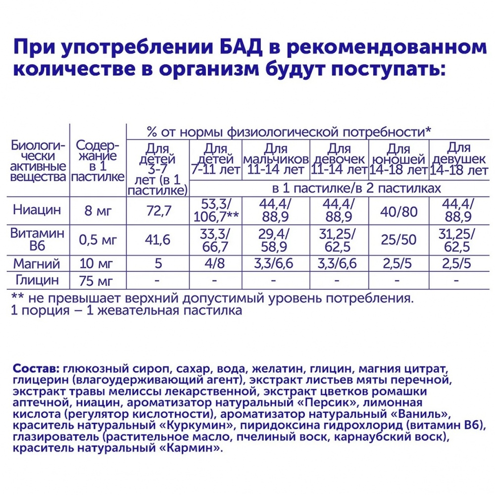 Применение: Рекомендуем принимать детям с 3-х лет по 1 пастилке в день.