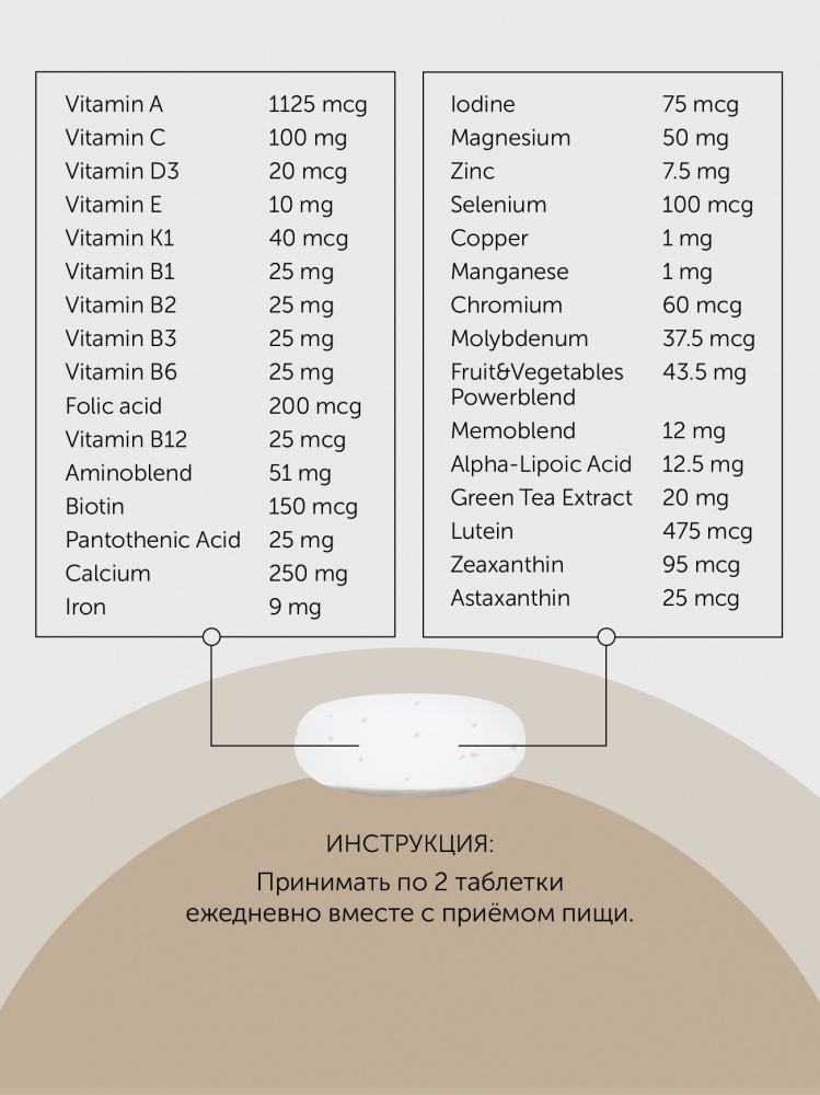 Принимать по 2 таблетки ежедневно вместе с приёмом пищи.